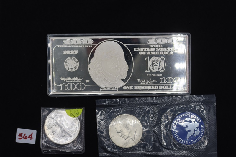 LOT, (1) 1997 WASHINTON MINT $100 .999 SILVER BAR, (1) SILVER EAGLE & (1) 1974 UNCIRCULATED SILVER DOLLAR (4.8 OZ SILVER)