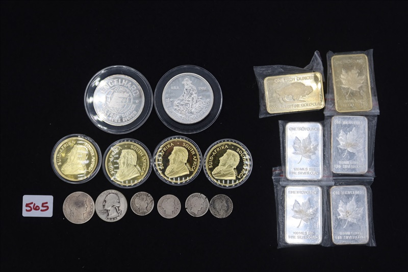 LOT, (2) ENGELHARD SILVER ROUNDS (2 OZ SILVER), (1) BARBER & (1) 1942 QUARTERS, (4) MERCURY DIMES, (4) KRUGERRAND COINS (COPIES) & (6) ASSORTED YELLOW AND WHITE METAL BARS (COPIES)