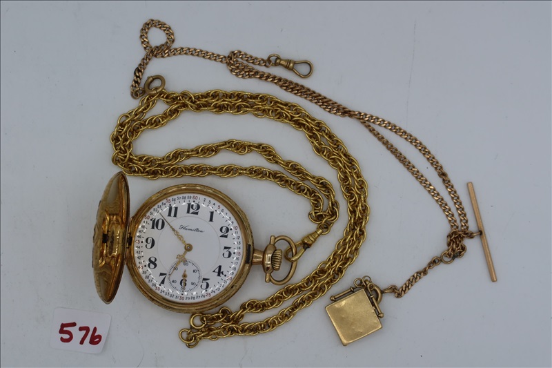 LOT, (1) HAMILTON YELLOW METAL POCKET WATCH WITH CHAIN & FOB