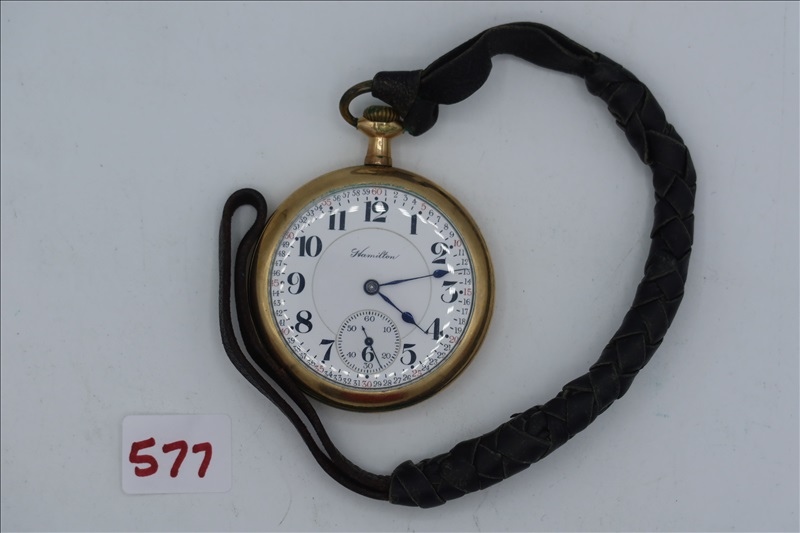 LOT, (1) HAMILTON YELLOW METAL POCKET WATCH WITH LEATHER BRAID