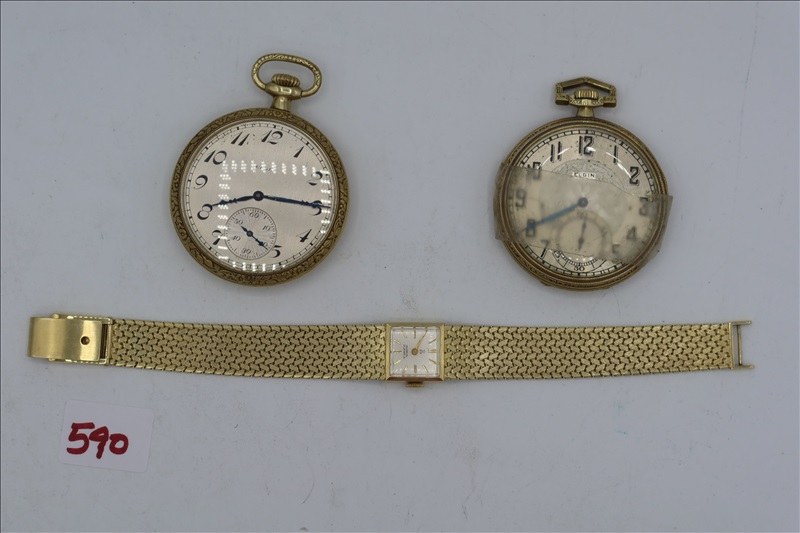 LOT, (2) ELGIN YELLOW METAL POCKET WATCHES (ONE NEEDS REPAIR) & (1) YELLOW METAL WATCH