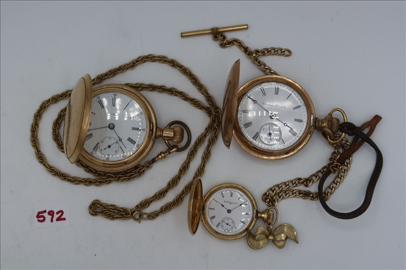 LOT, HAMPTON, WALTHAM, ELGIN (3) YELLOW METAL POCKET WATCHES (REPAIRS NEEDED)