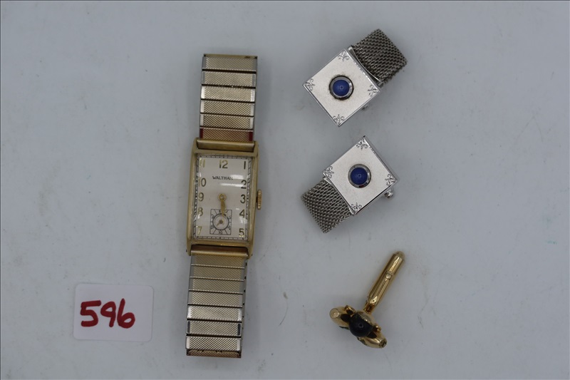 LOT, (1) WALTHAM YELLOW METAL WATCH, (2) WHITE METAL W/BLUE STONES & (1) YELLOW METAL CUFFLINK W/BLACK STONE