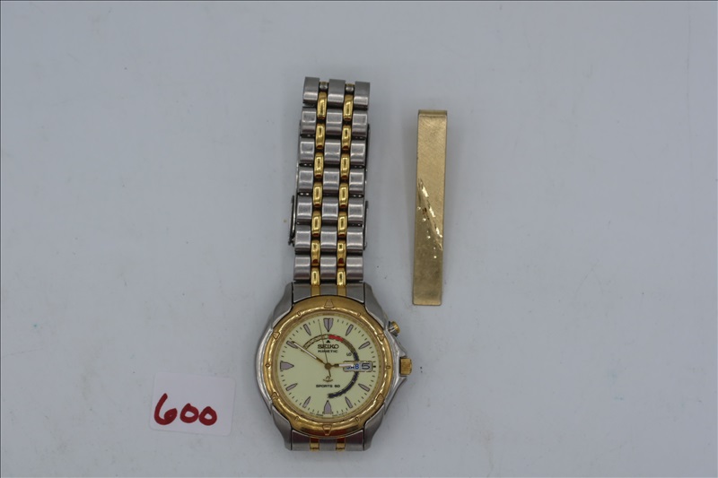 LOT, (1) SEIKO YELLOW AND WHITE METAL WATCH & (1) YELLOW METAL CLIP