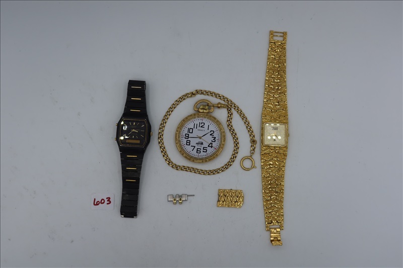 LOT, (1) SAMUEL'S YELLOW METAL POCKET WATCH (1) TELUX YELLOW METAL WATCH, (1) SEIKO BLACK METAL WATCH & YELLOW METAL WATCH PIECES