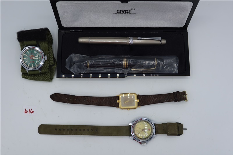 LOT, (3) ASSORTED WATCHES & (2(MONT BLANC PENS IN A CASE