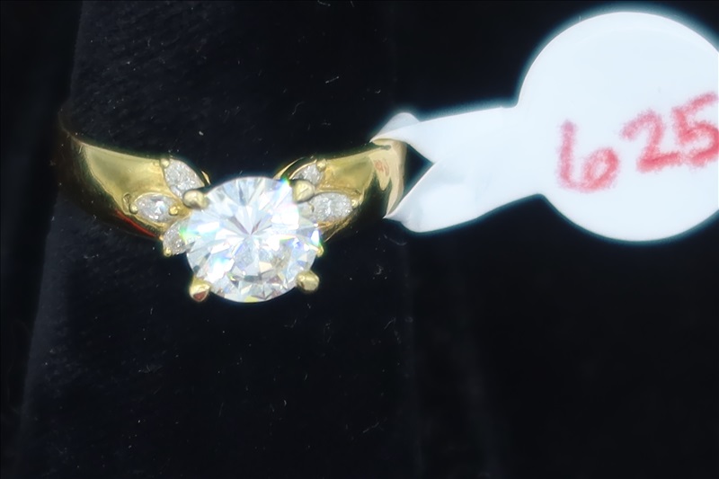 LOT, YELLOW METAL RING WITH CLEAR STONES SIZE: 7.5 (TESTS POSITIVE FOR DIAMONDS)