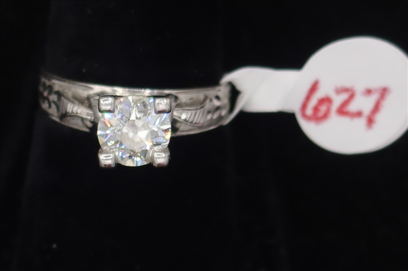 LOT, (1) WHITE METAL RING WITH CLEAR STONES, SIZE: 8.25 (TEST POSITIVE FOR DIAMOND)