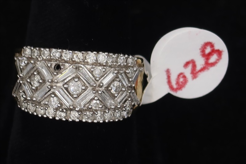 LOT, (1) YELLOW METAL RING WITH CLEAR STONES, SIZE: 7 (TESTS POSITIVE FOR DIAMONDS (MISSING A STONE)