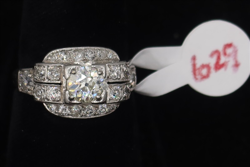 LOT, (1) WHITE METAL RING WITH CLEAR STONES, SIZE: 7 (TESTS POSITIVE FOR DIAMONDS)