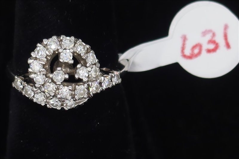 LOT, (1) WHITE METAL RING WITH CLEAR STONES, SIZE: 6.5 (TESTS POSITIVE FOR DIAMONDS)