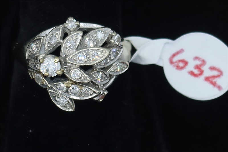 LOT, (1) WHITE METAL RING WITH CLEAR STONES, SIZE: 7.75 (TESTS POSITIVE FOR DIAMONDS)