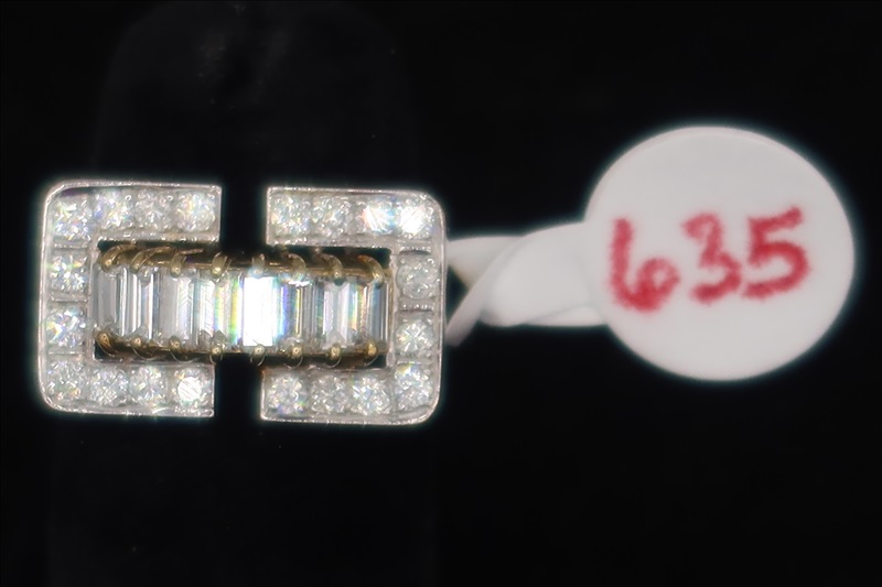 LOT, (1) WHITE & YELLOW METAL RING WITH CLEAR STONES, SIZE: 4 (TESTS POSITIVE FOR DIAMONDS)