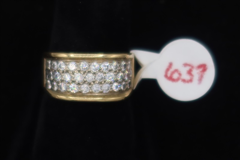 LOT, (1) YELLOW METAL RING WITH CLEAR STONES, SIZE: 5.75 (TESTS POSITIVE FOE DIAMONDS)