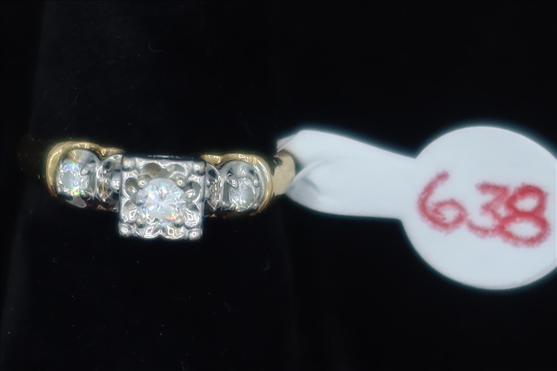 LOT, (1) YELLOW METAL RING WITH CLEAR STONES, SIZE: 6 (TESTS POSITIVE FOR DIAMONDS)