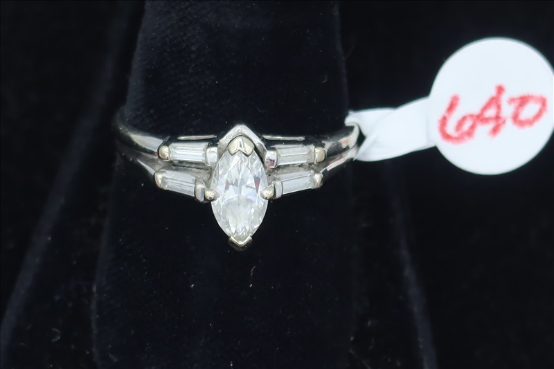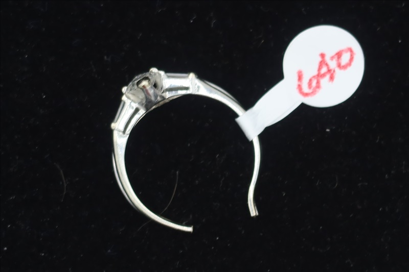 LOT, (1) WHITE METAL RING WITH CLEAR STONES, SIZE: 9 (TESTS POSITIVE FOR DIAMONDS) (NEEDS REPAIR)