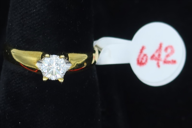 LOT, (1) YELLOW METAL RING WITH CLEAR STONES, SIZE: 6.5 (TESTS POSITIVE FOR DIAMONDS)