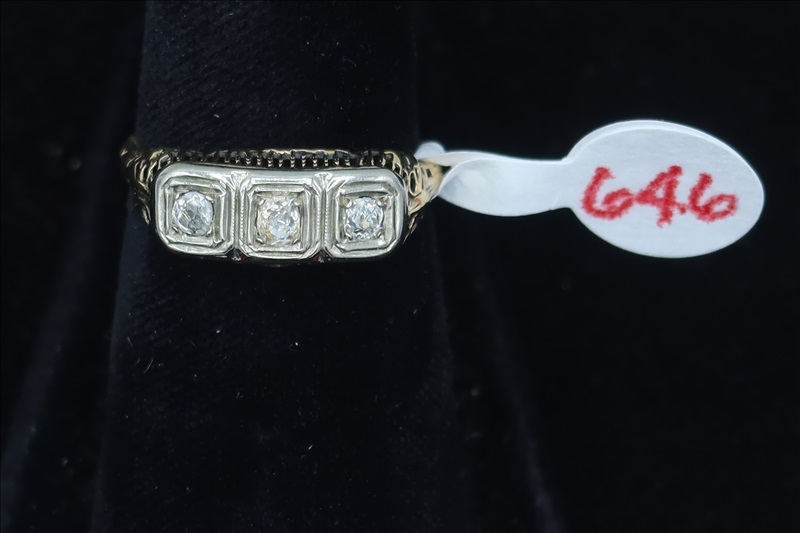 LOT, (1) YELLOW METAL RING WITH CLEAR STONES, SIZE: 6.5 (TESTS POSITIVE FOR DIAMONDS)