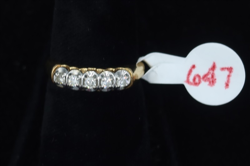 LOT, (1) YELLOW METAL RING WITH CLEAR STONES, SIZE: 6 (TESTS POSITIVE FOR DIAMONDS)