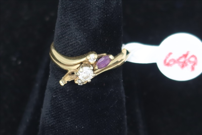 LOT, (1) YELLOW METAL RING WITH CLEAR STONES, SIZE: 5.5 (TESTS POSITIVE FOR DIAMONDS)(MISSING ONE STONE)