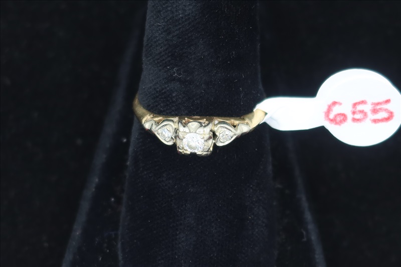 LOT, (1) YELLOW METAL RING WITH CLEAR STONES, SIZE: 8 (TESTS POSITIVE FOR DIAMONDS)