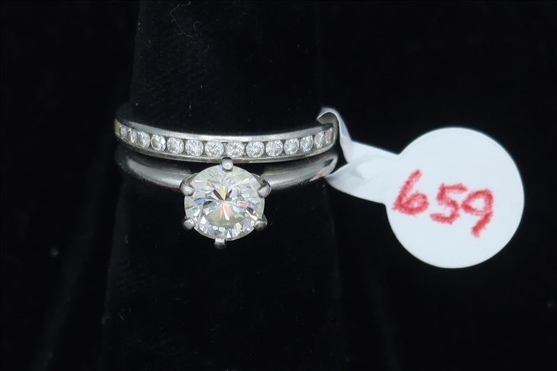 LOT, (1) WHITE METAL SET OF RINGS WITH WHITE STONES, SIZE:6 (TESTS POSITIVE FOR DIAMONDS)