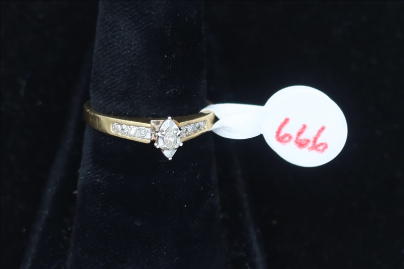 LOT, (1) YELLOW METAL RING WITH CLEAR STONES, SIZE: 7 (TESTS POSITIVE FOR DIAMONDS)
