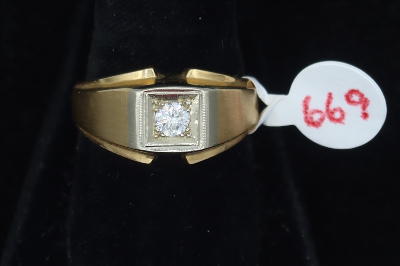 LOT, (1) YELLOW METAL RING WITH CLEAR STONE, SIZE: 9.75 (TESTS POSITIVE FOR DIAMOND)