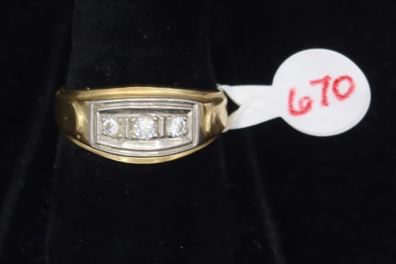 LOT, (1) YELLOW METAL RING WITH CLESR STONES, SIZE: 9 (TESTS POSITIVE FOR DIAMONDS)
