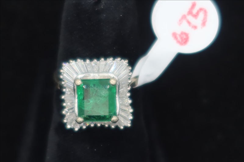 LOT, (1) WHITE METAL RING WITH CLEAR & GREEN STONES, SIZE: 4.75 (TESTS POSITIVE FOR DIAMONDS)