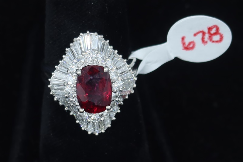LOT, (1) WHITE METAL RING CLEAR AND RED STONES, SIZE: 6.5 (TESTS POSITIVE FOR DIAMOND)