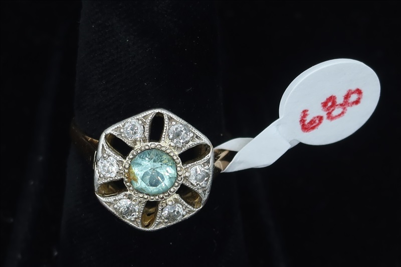 LOT, (1) YELLOW RING WITH AQUA & CLEAR STONES, SIZE: 7.25 (TESTS POSITIVE FOR DIAMONDS)
