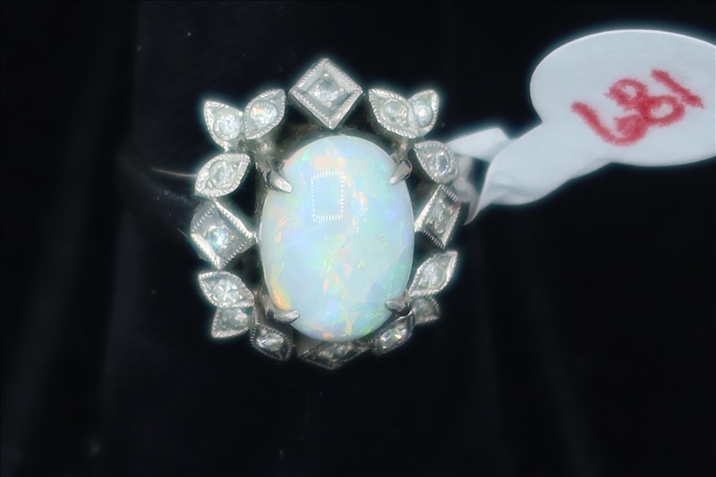 LOT, (1) WHITE METAL RING WITH CLEAR & OPAL LIKE STONES, SIZE: 7 (TESTS POSITIVE FOR DIAMONDS)