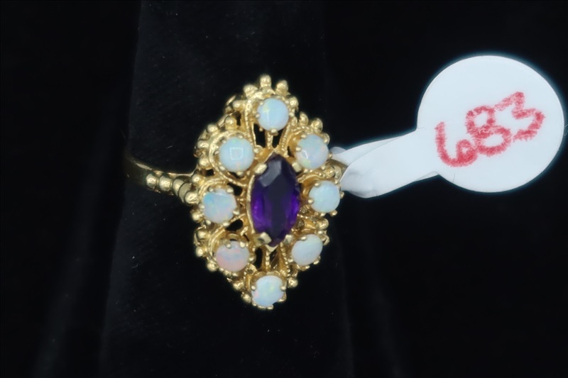 LOT, (1) YELLOW METAL RING, WITH PURPLE & OPAL LIKE STONES, SIZE: 5.75 (TESTS POSITIVE FOR DIAMONDS)