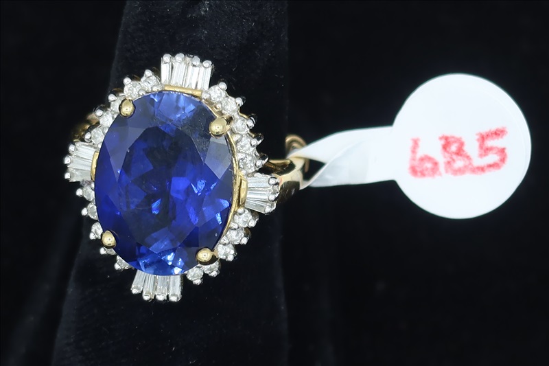 LOT, (1) YELLOW METAL RING WITH CLEAR & BLUE STONES, SIZE: 5 (TESTS POSITIVE FOR DIMONDS)