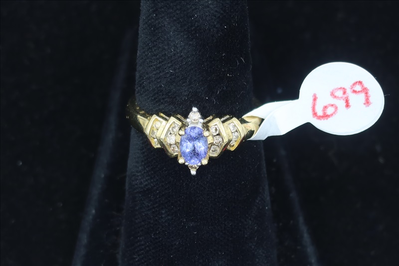 LOT, (1) YELLOW METAL RING WITH CLEAR & LAVENDER STONES, SIZE: 7.25 (TESTS POSITIVE FOR DIAMOND)