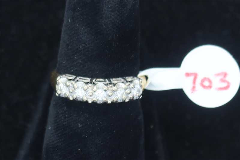LOT, (1) YELLOW RING WITH CLEAR STONES. SIZE:6.25 (TESTS POSITIVE FOR DIAMONDS