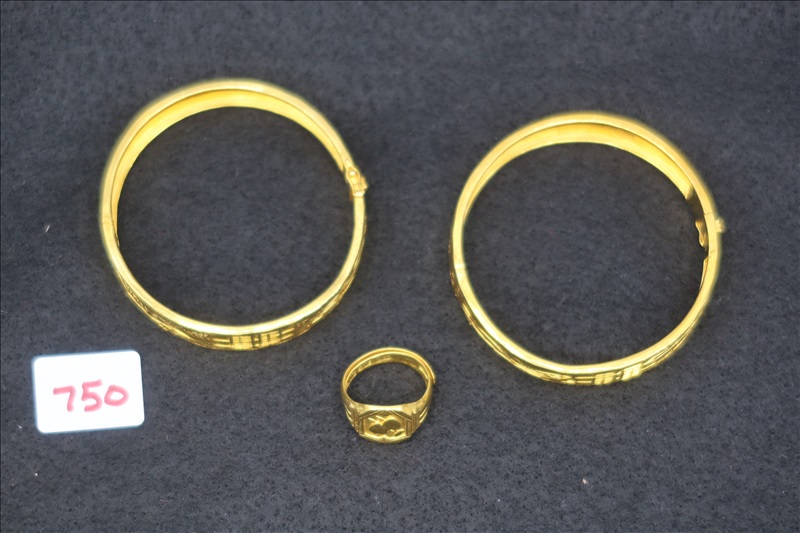 LOT, (1) YELLOW METAL RING & (2) YWLLOW METAL BANGLES