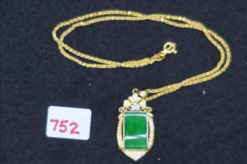 LOT, (1) YELLOW METAL NECKLACE AND PENDANT WITH CLEAR & GREEN STONES (TESTS POSITIVE FOR DIAMOND)