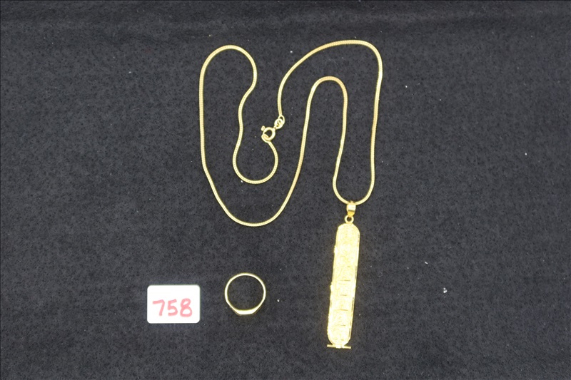 LOT, (1) YELLOW METAL RING & (1) YELLOW METAL NECKLACE