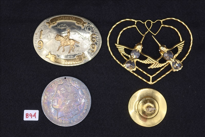 LOT, (1) YELLOW METAL FIGURINE, (1) MORGAN MEDALIAN & (1) 1969 BAREBACK RESCUE BELT BUCKLE