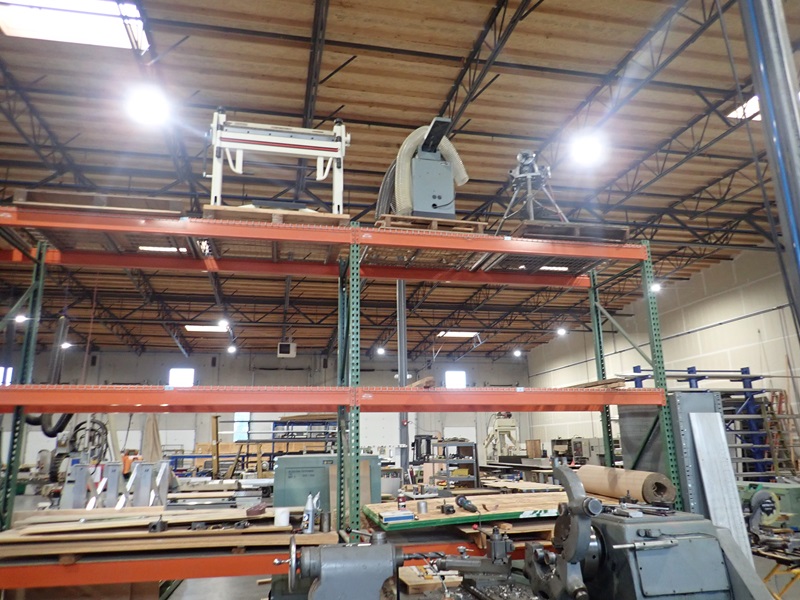 (5) SECTIONS OF PALLET RACKING, HITACHI MITER SAW, JET BRAKE, DELTA JOINTER, RIDGID PIPE MACHINE, LAYOUT TABLE, LADDERS & MISC.