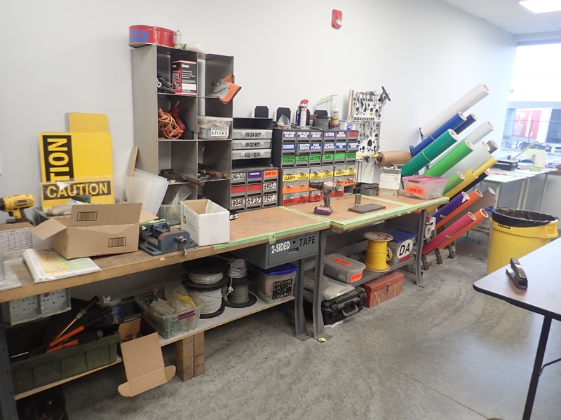 (2) CUTTING PLOTTERS, OLD ROUTER, BENCHES, CABINETS & MISC.