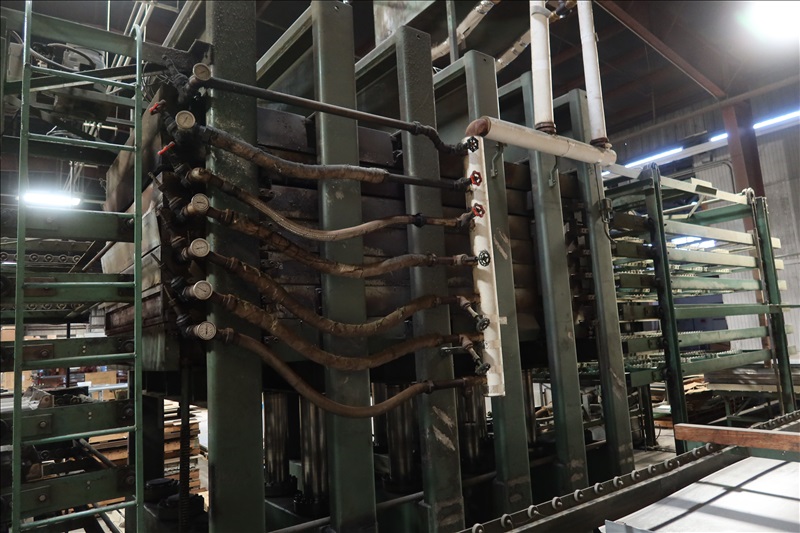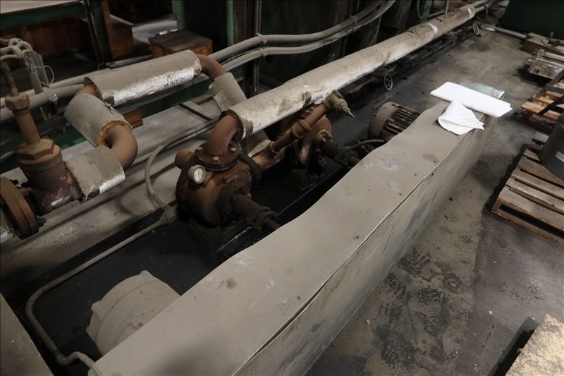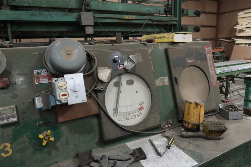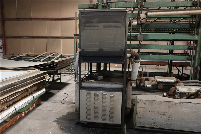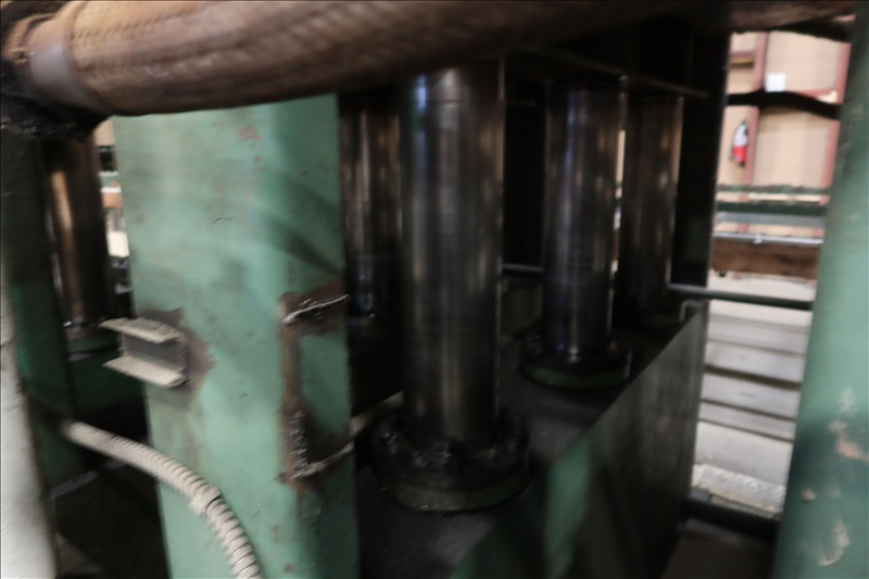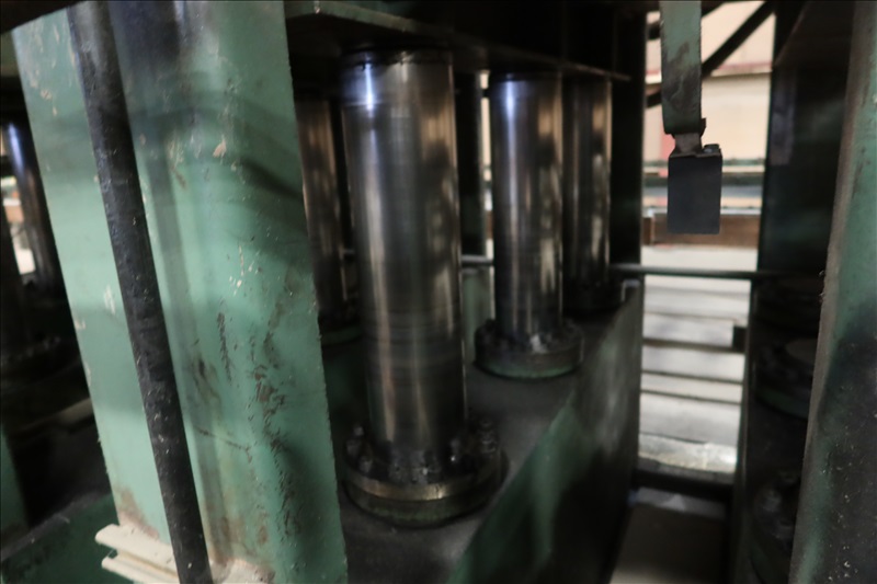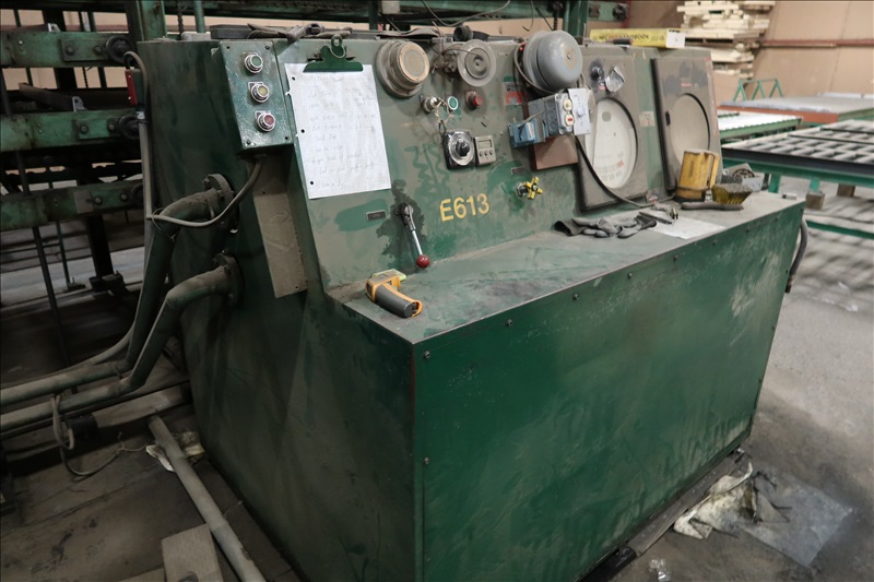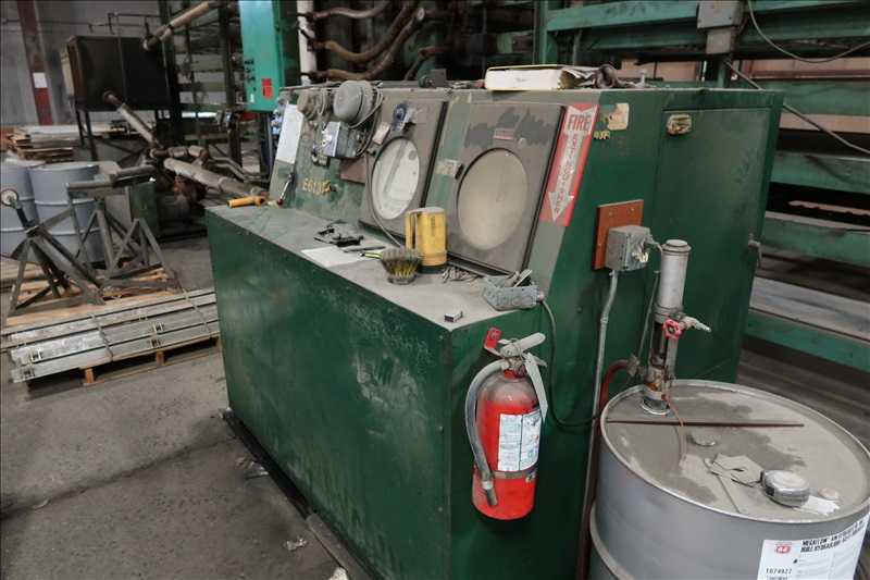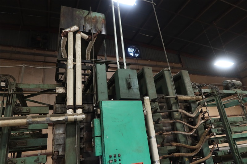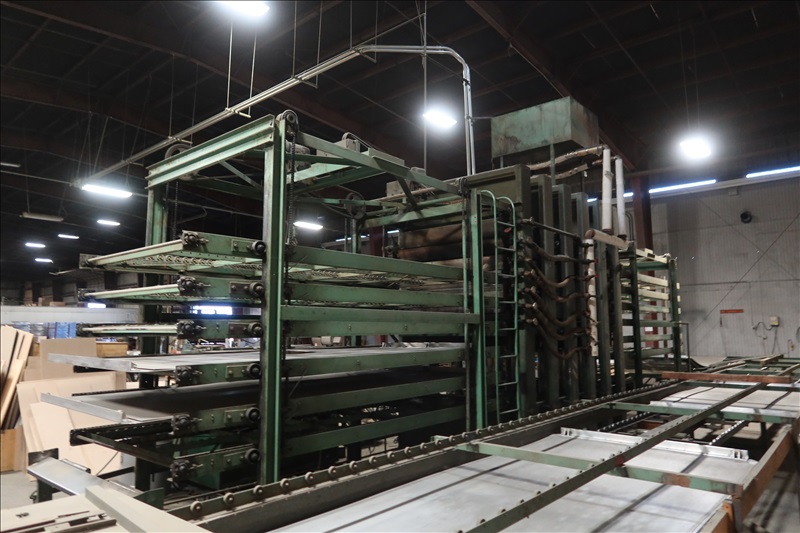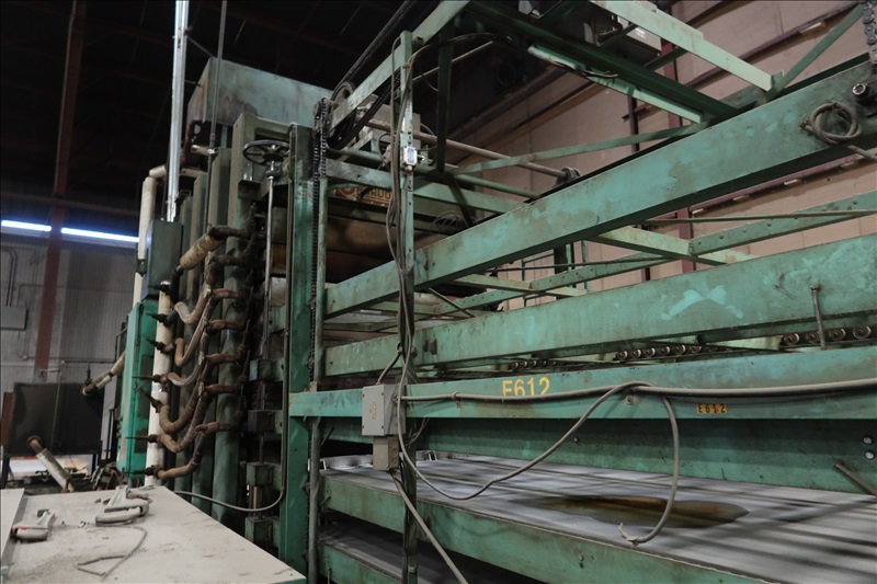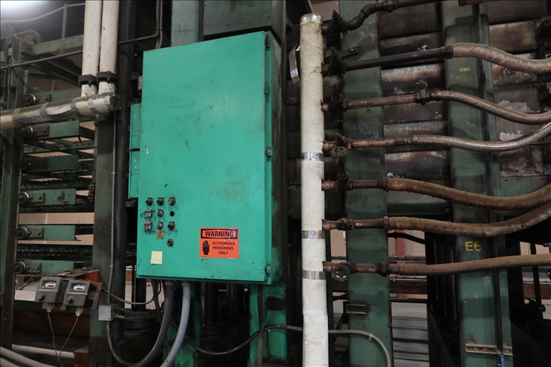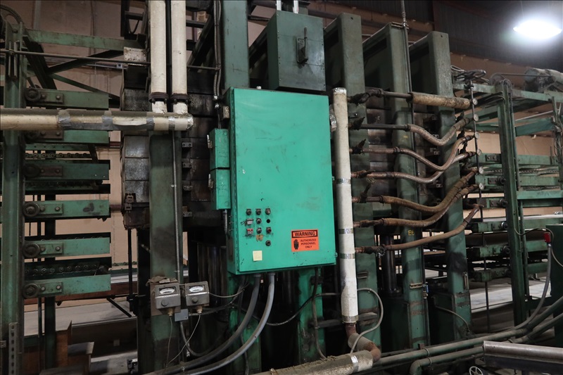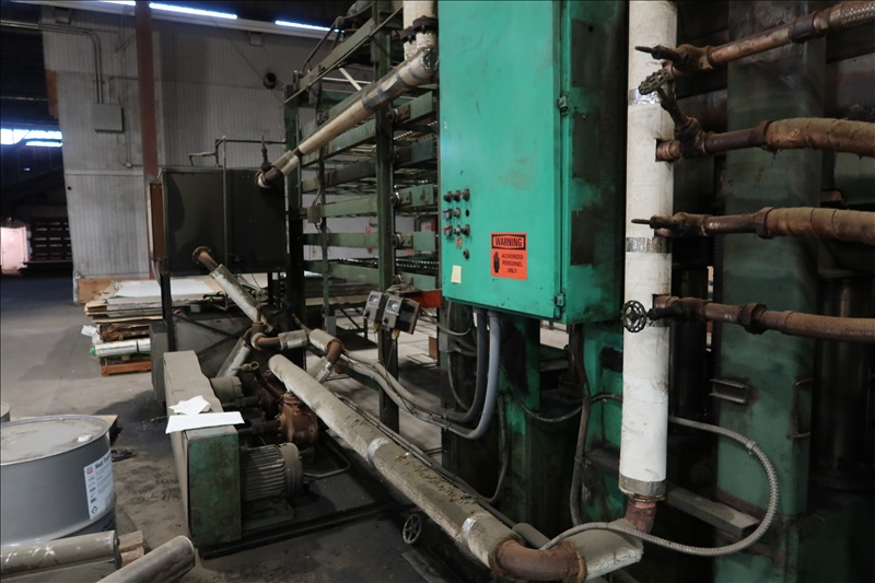 HOT PRESS (6) 72"X164" PRESSURIZED PLATENS, (6) PRESS STATIONS W/(3) HYDRAULIC CYLINDERS EACH, PRESSURE GAUGES, (2) VIKING 120 OIL PUMPS, ELECTRIC OIL HEATER, (6) 16' INFEED TABLES, (6) 16' OUTFEED TABLES, BARTLOW INLINE TEMPERATURE CONTROLS, HONEYWELL MASTER TEMPERATURE CONTROLS, 40-15 HP, 440V, 3 PHASE