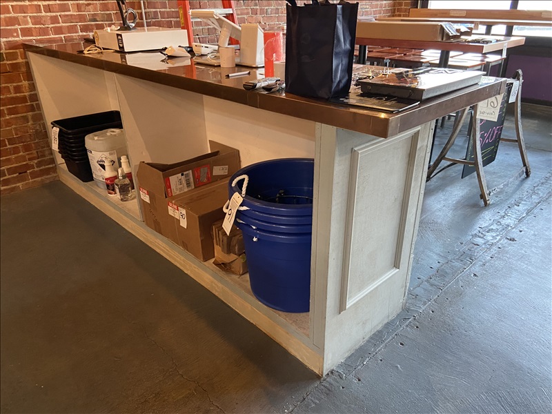 APPROX 2-1/2' X 10' BRUSHED COPPER TOP WOOD BAR (THIS UNIT WAS BUILT IN PLACE, 1 PIECE AND IS VERY HEAVY)