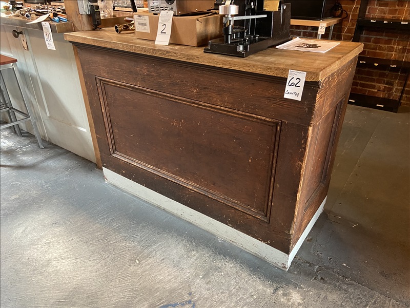 26" X 58" ANTIQUE WOOD COUNTER (MUST BE CAREFULLY TILTED WHEN MOVED AS THERE IS A WATER PIPE UNDER COUNTER)
