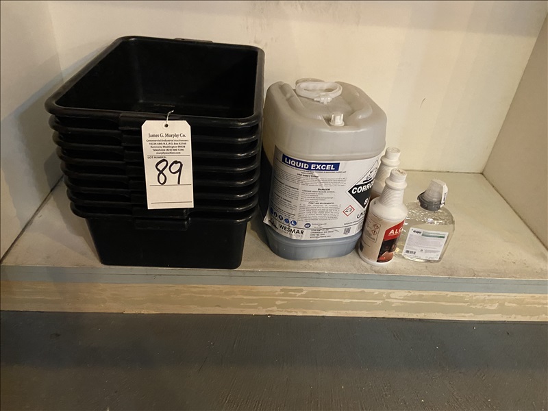 LOT, ASSORTED CLEANING SUPPLIES & DIRTY DISH TUBS