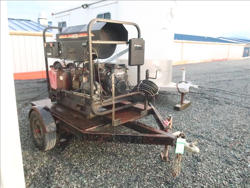 S/A 3,000 PSI TRAILER MOUNTED HOT WATER PRESSURE WASHER, 16 HP GAS, NO 2 FUEL BURNER, HOSE & WAND