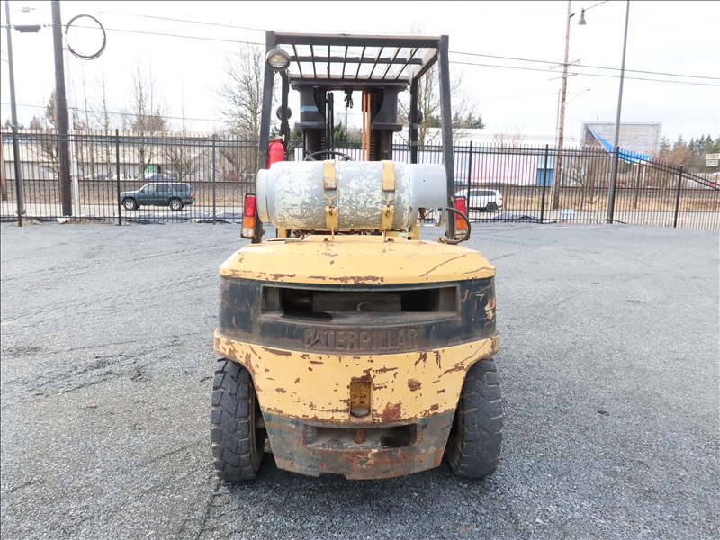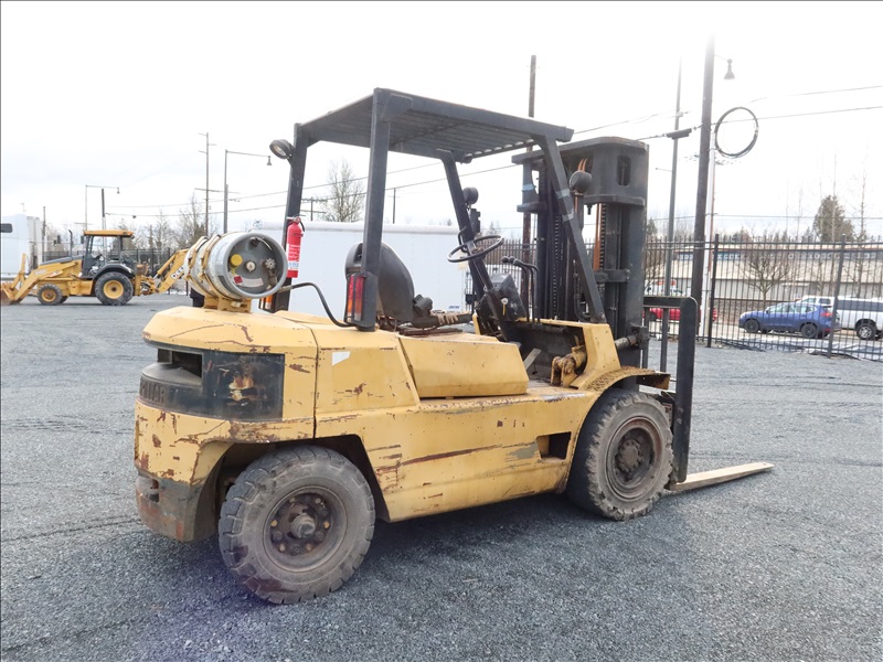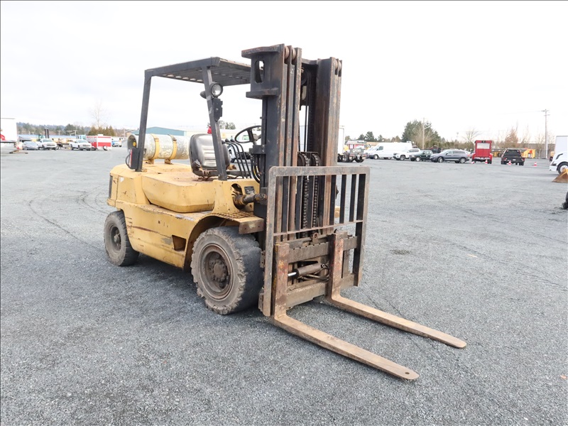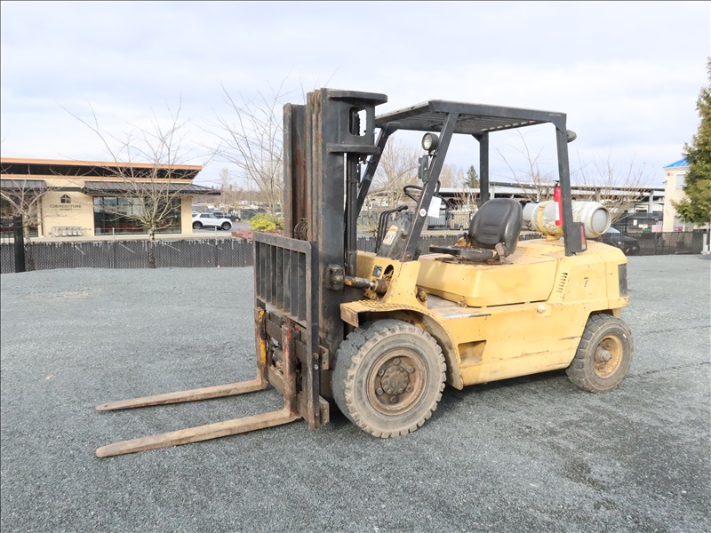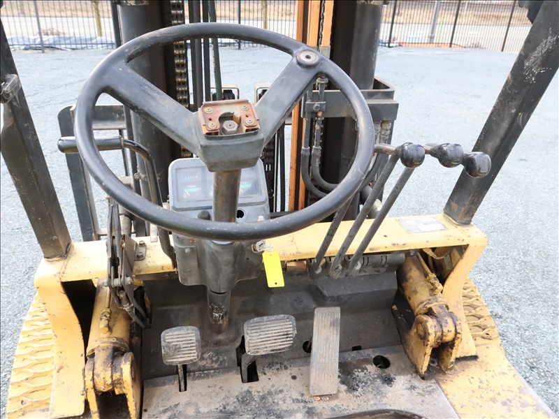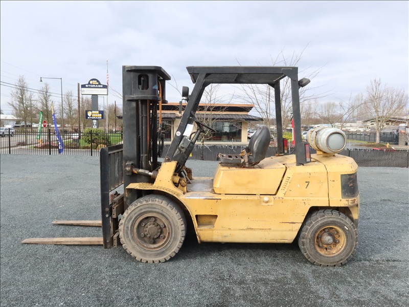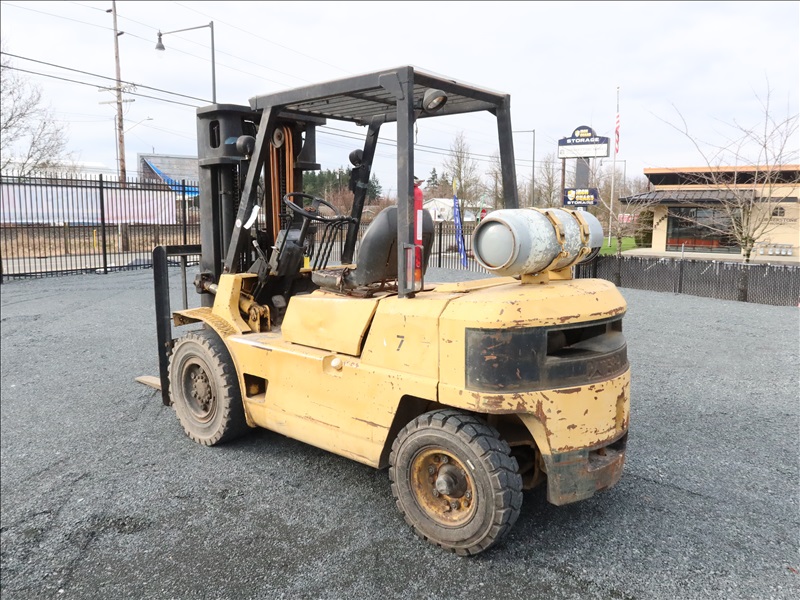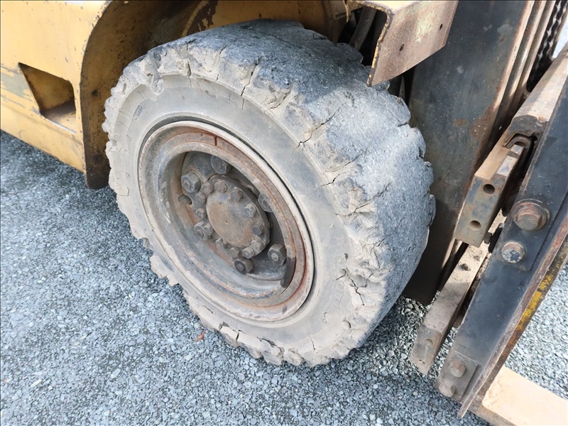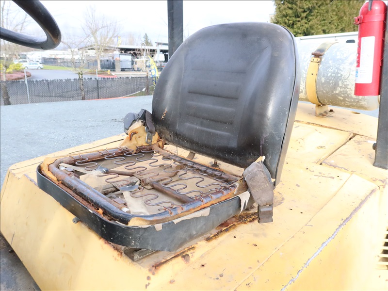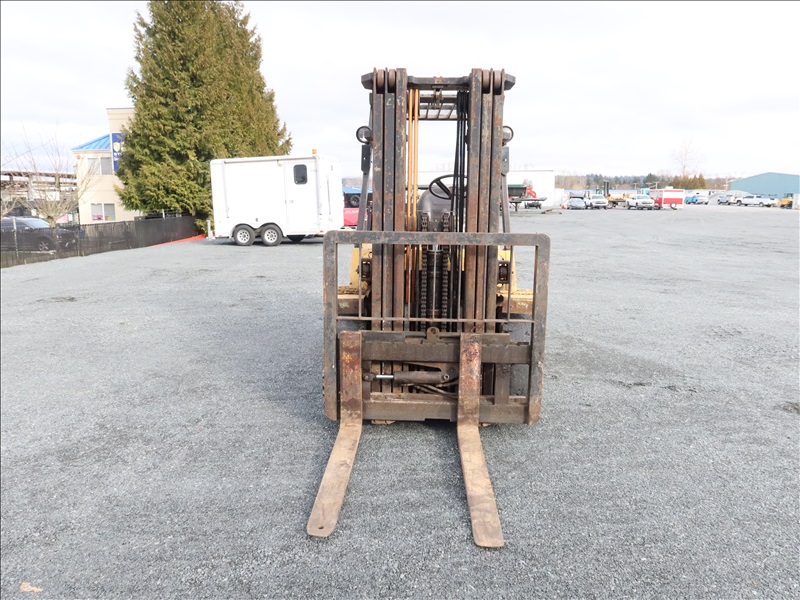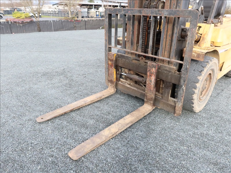 8,000 LB CUSHION TIRE FORKLIFT, 182" FORK HEIGHT, 3-STAGE MAST, SIDE SHIFT, 6 CYL PROPANE
