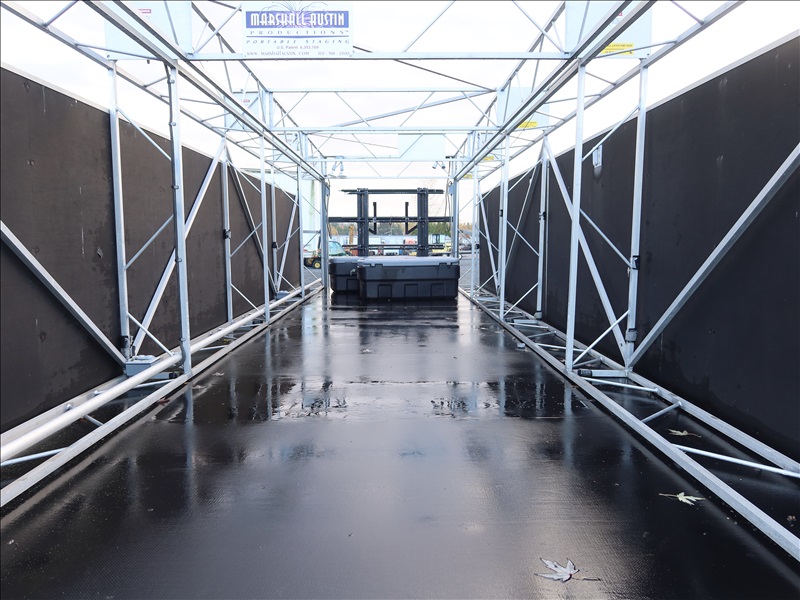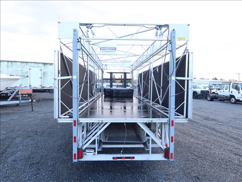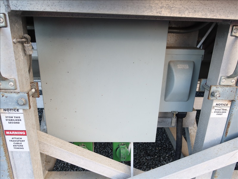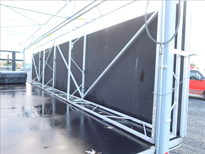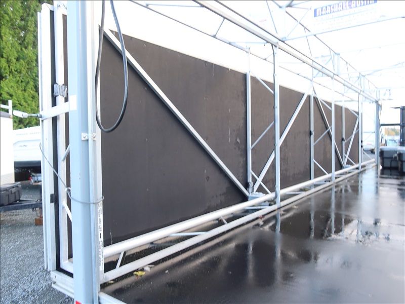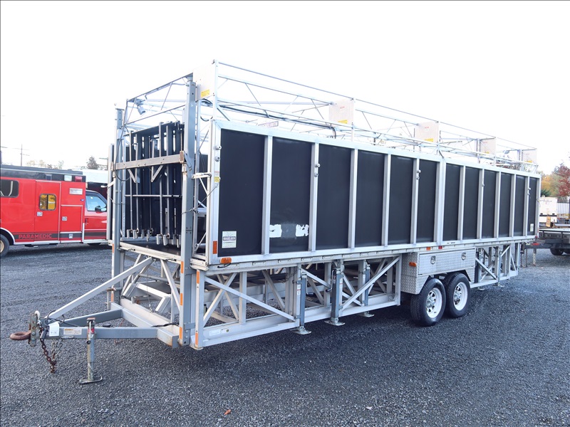 T/A, 24' X 8'4" ALUMINUM PORTABLE STAGING TRAILER, 7'10" CENTER STAGE & (2) FOLD DOWN SIDES (TOTAL STAGE AREA APPROX 24' X 16'), RAMP, STAIRS, STABILIZER JACKS, ELECT BRAKES, 205/75R15